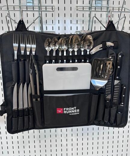Tasken er udstyret med ophængsløkker og karabinhager, så den kan hænges op i åben position og give hurtig og nem adgang til alle redskaber, når du skal kokkere.