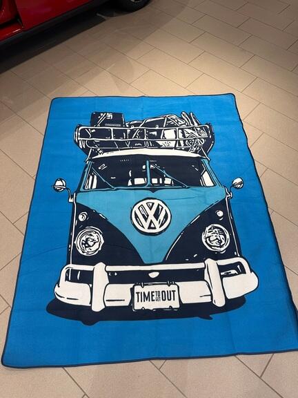 Flot Volkswagen picnictæppe i fleece med vandafvisende materiale på bagsiden.